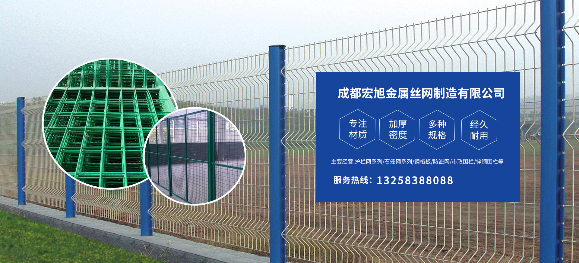 成都宏旭金屬絲網(wǎng)制造有限公司主營護(hù)欄網(wǎng)系列、石籠網(wǎng)系列、鋼格板、防盜網(wǎng)、市政圍欄、鋅鋼圍欄、鋼筋網(wǎng)片、聲屏障系列、波形護(hù)欄板、柔性纜索護(hù)欄、SNS邊坡防護(hù)網(wǎng)等其他絲網(wǎng)類產(chǎn)品。特殊規(guī)格可加工定做,也可根據(jù)客戶來圖來樣定做。自創(chuàng)業(yè)以來,公司一直堅持市場為導(dǎo)向,以客戶為根本,以實業(yè)為基礎(chǔ),以技術(shù)為支持,以科研為后盾,集科研、生產(chǎn)、經(jīng)營為一體,不斷研制開發(fā)新產(chǎn)品,開拓市場,走綜合發(fā)展之路。多年來,公司憑借過硬的質(zhì)量,良好的信譽、優(yōu)質(zhì)的服務(wù)、合理的價格,贏得了市場和商家的一致好評。